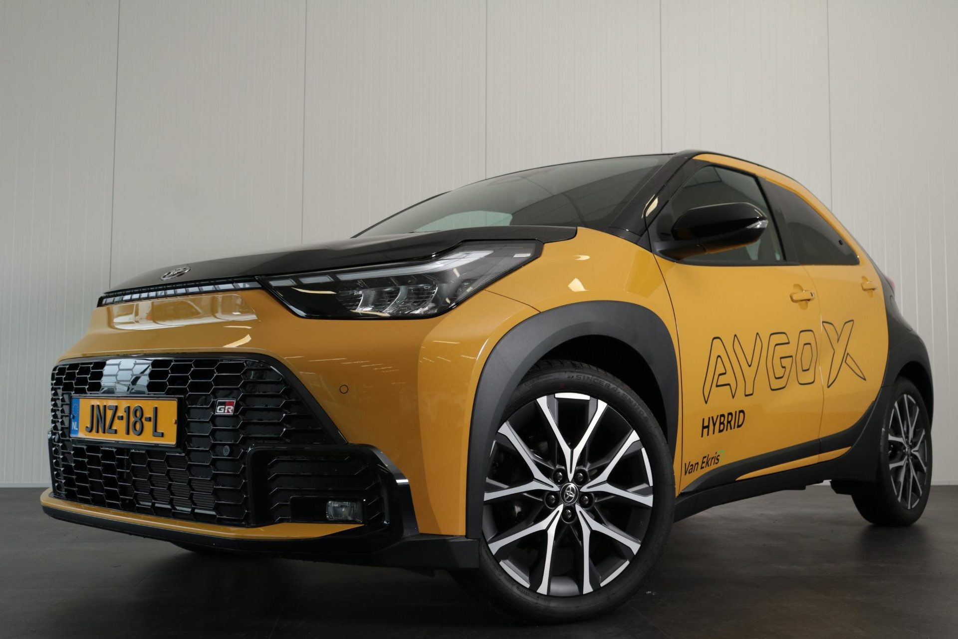 Prachtige Aygo X Hybrid GR Sport in de exclusieve kleur Mustard metallic met Zwart dak .